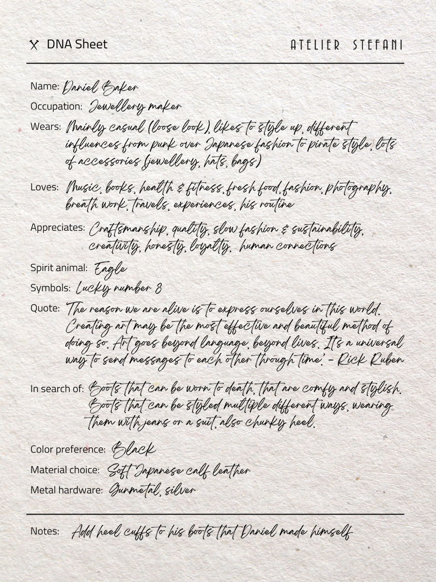We developed the pattern of Danny’s made-to-measure boots and cut the parts from his chosen leather - the softest, sustainably tanned Japanese calf skin.
